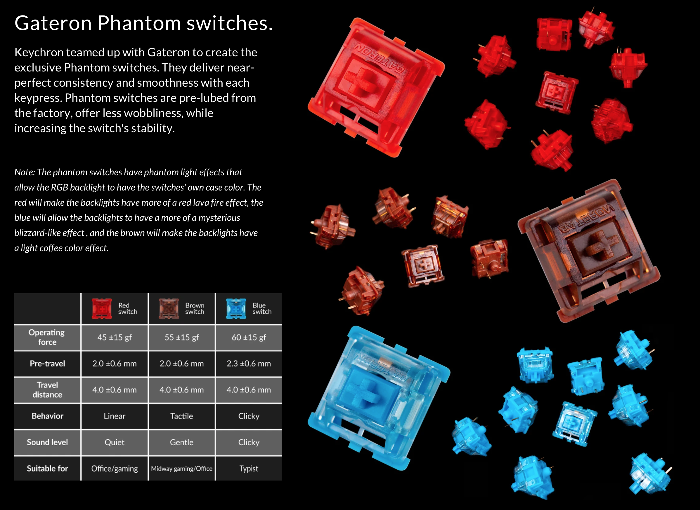 게이트론팬텀 스위치는 게이트론과 키크론이 협력해 만든 스위치인데 기존의 스위치와는 약간 다른 색감을 가지고 있고 모든 스위치가 공장에서 윤활이 되어나와 별도의 윤활작업이 필요없다.