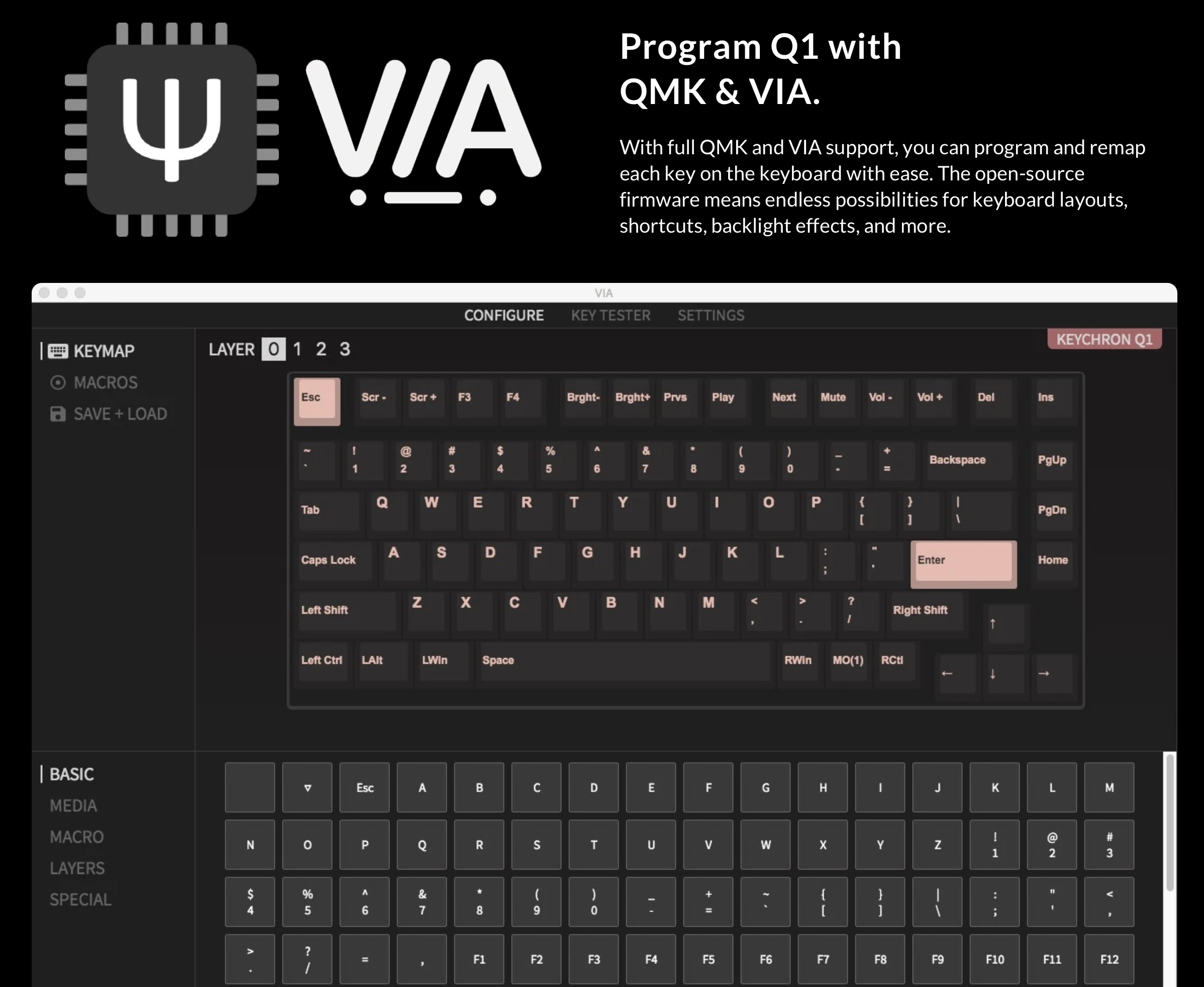 QMK/VIA 를 이용하여 키입력방식 변경과 매크로 설정이 가능하다는 설명