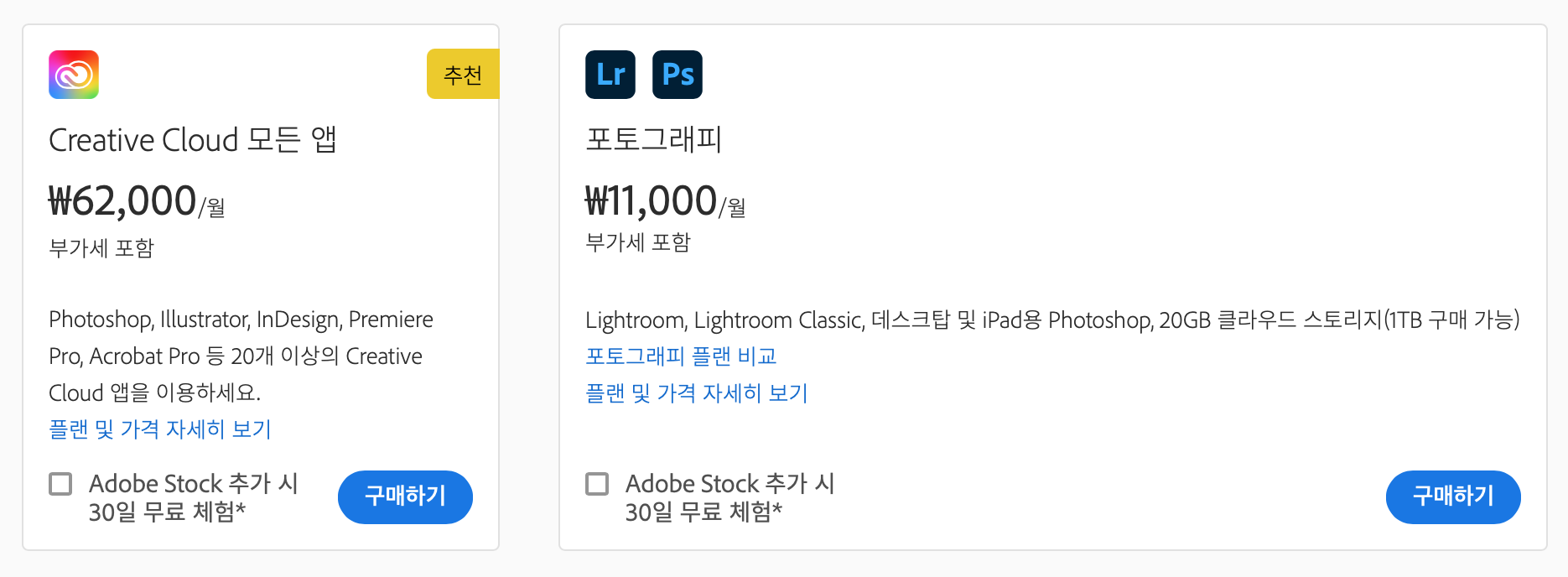 꾸준히 이용하는 사람들은 알겠지만, 만약 포토샵CC 한개만 사용하려면 어도비 라이트룸과 함께 사용할수 있는 가장 저렴한 플랜인 어도비 포토그래피 플랜(월 11,000원)을 사용하면 되지만, 이를 제외한 일러스트레이터, 인디자인, 프리미어, 애프터 이펙트 등을 단1개라도 더 사용하게 되면 당연히 Adobe Creative Cloud 모든앱 플랜(월 62,000)을 사용하는것이 가격면에서는 합리적이다.