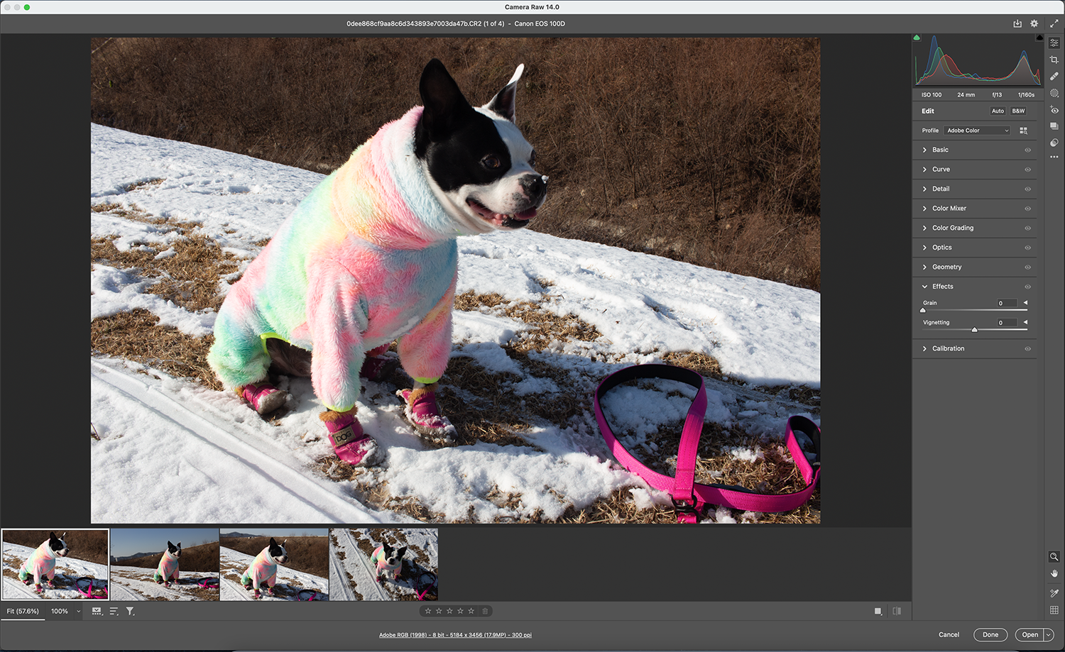 기본적으로 RAW 파일을 포토샵에서 열었을경우 자동으로 RAW파일 보정 툴에서 사진이 열리게 된다. 오늘 보정해볼 사진들 4장이 하단에 배치되어있다. 기본적으로 오른쪽 사이드의 기능을 단 몇 번의 클릭으로 예쁜 사진으로 보정할 수 있다.
